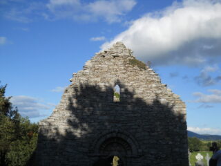 It is noted in history that Ullard Church of St. Fiacre, and Mullenakill Church of St. Moling were repeatedly attacked and burned. The Vikings, from 824 up to 951, were frequently plundering and burning the area and later the native Irish were attacking these areas. The sedilla and piscine are found housed within a semi-circular-arch, in the choir, but the altar is missing. The surviving window is a two-light ogee-headed window, carved from cut limestone. An underground vaulted chamber at the east end of the choir is the burial crypt for the Eustace family of Ballamurrough House. A stone staircase from the choir lead up through the thickness of the wall, going from a straight staircase to a spiral staircase. The belfry once housed the Sanctus bell. In the surrounding graveyard is a High Cross, found to be fragmented into three pieces, now rebuilt with the middle portion of the shaft made from modern day cement. The granite high cross now stands 4m tall. The high cross is richly decorated with knots of interlace and four-legged spirals. Identifiable Biblical depictions include the Apostles, the Crucifixion, Longinus piercing Christ’s side, Stephaton offering vinegar, David and Goliath, the Binding of Isaac, Adam and Eve, The Judgement of Solomon, The Slaughter of the Innocents and The Temptation of St. Anthony. A cross-slab within the graveyard, re-used as a grave marker, shows signs of a human figure having been carved into it. The headstones within the graveyard date from the 18th century onwards.