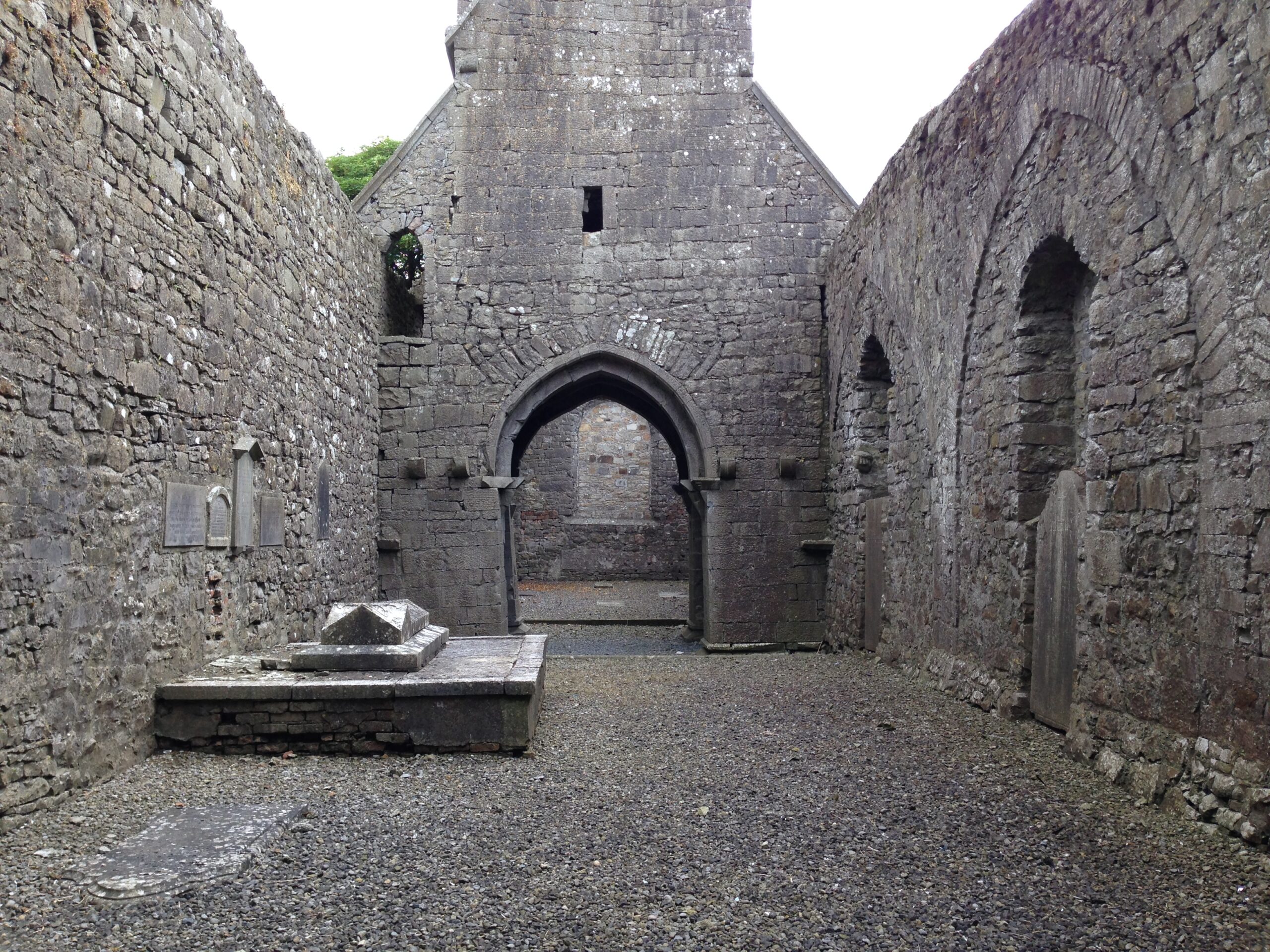 Dunmore Abbey, with is late Gothic architecture, is a nave and chancel church, rectangular in plan. The 16th century addition of a three-storey tower marks the division between the nave and chancel. The main doorway, dated to the 15th century is decorated with three shallow orders, fluted chamfers, moulded capitals, and side pinnacles with poppy-heads. Above the doorway is a memorial table translated as ‘Pray for the soul of Walter de Bermingham who had me made’. In the nave, a quoin stone has been re-used in the eastern window and is carved in the form of a female head with an elaborate head-dress. Under the tower’s pointed chancel arch, some of the original plaster and wickering survives, along with a carved head. The chancel was used from the 18th century as the parish church for the Church of Ireland, up to 1879. In the chancel there is a grave slab with a Latin inscription, dated 1691.