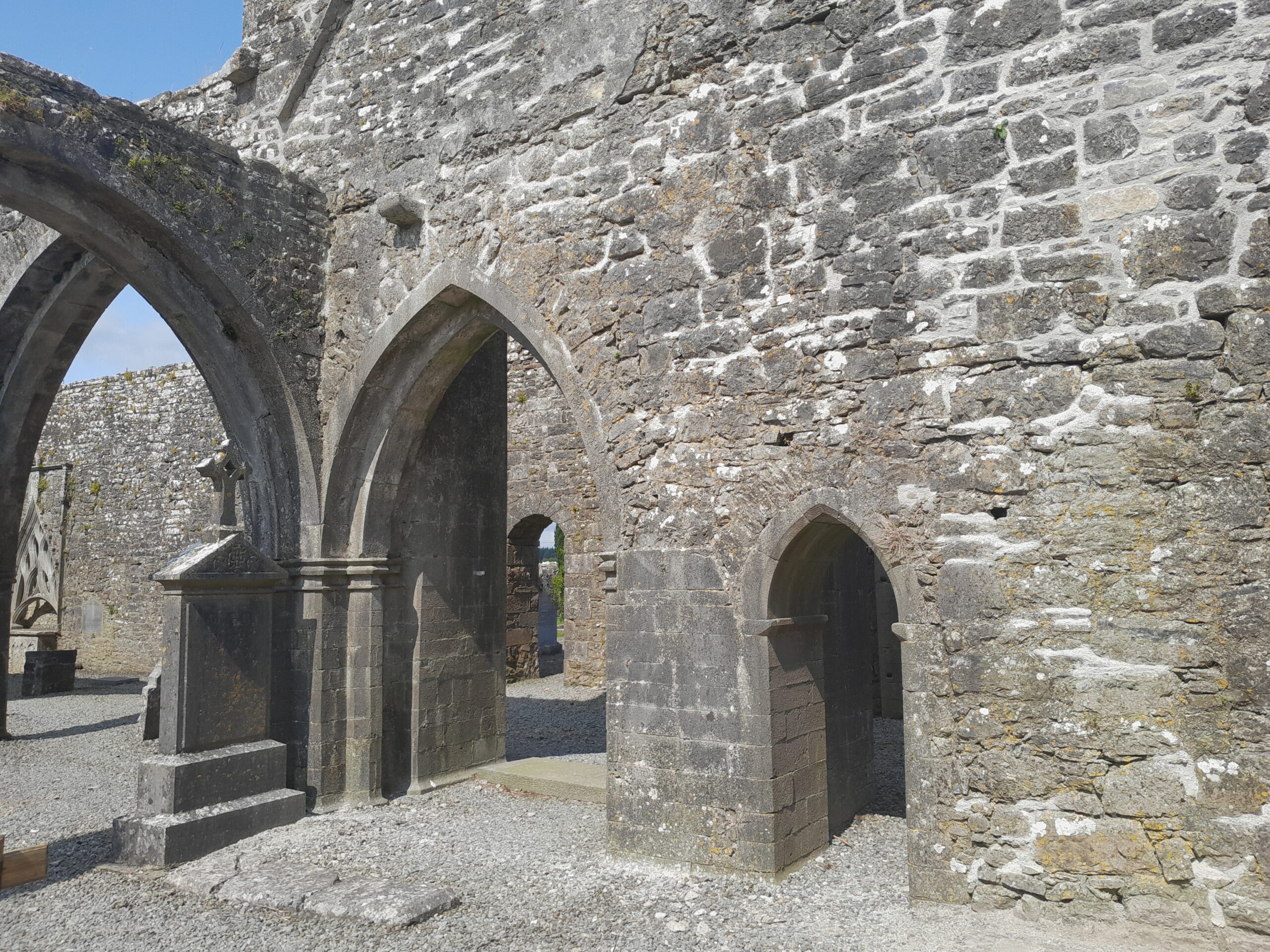 Presently, the site contains a nave and chancel church with a south aisle and transept with a three-storey slim tower, domestic ranges and a partial cloister. Entry is via the west side doorway, with the area within lit by several traceried windows. In the nave, one of several elaborately carved canopied tomb-niches is found. Two figures are carved into stone above the canopy, one is believed to be St. Francis. The six stone carved figures at the base are (from left): St. John the Evangelist, St. Louis of Toulouse, The Virgin Mary, St. John the Baptist, St. James of Compostela and St. Denis of Paris. The south transept has two tomb niches. The chapel, known as O’Donellan chapel, opens off the transept. The chancel, lit by a four-light window, has the wall tomb of the Daly family.